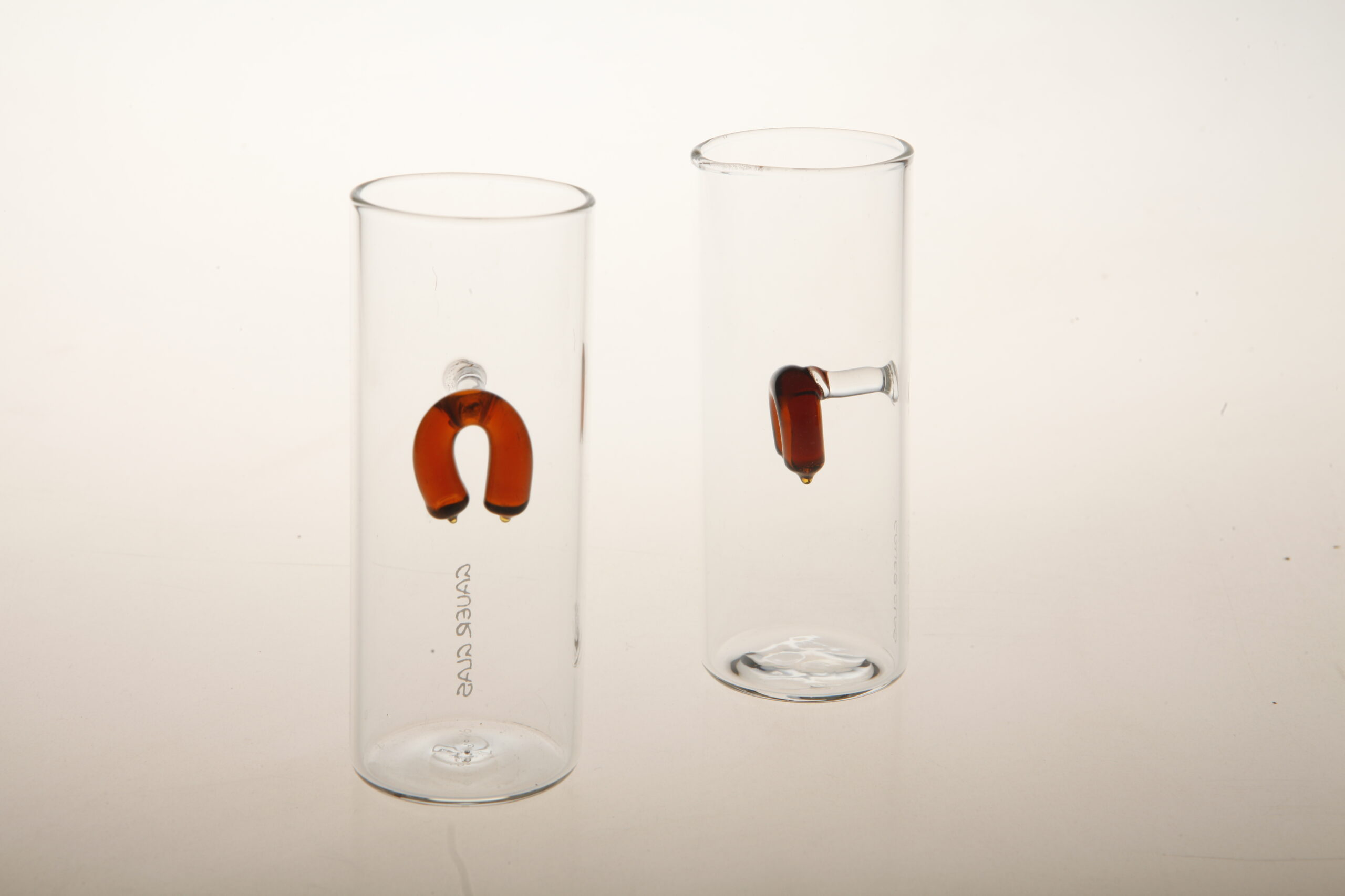 Das Schnapsglas ist innen mit einem Lyoner verziert, der Hingucker beim Trinken…