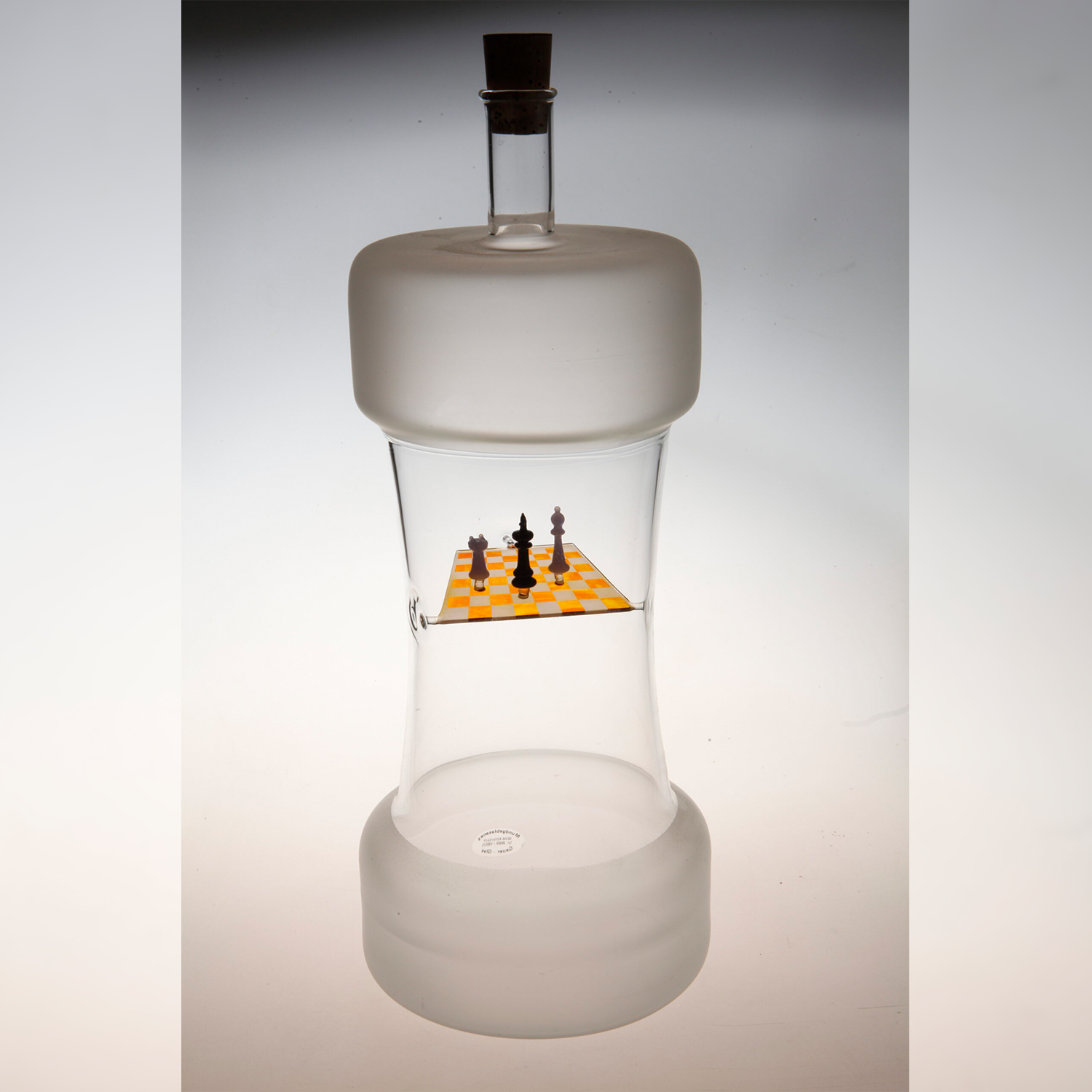 In die turmförmige Flasche ist perspektivisch ein Schachbrett mit Spielfiguren eingelassen.