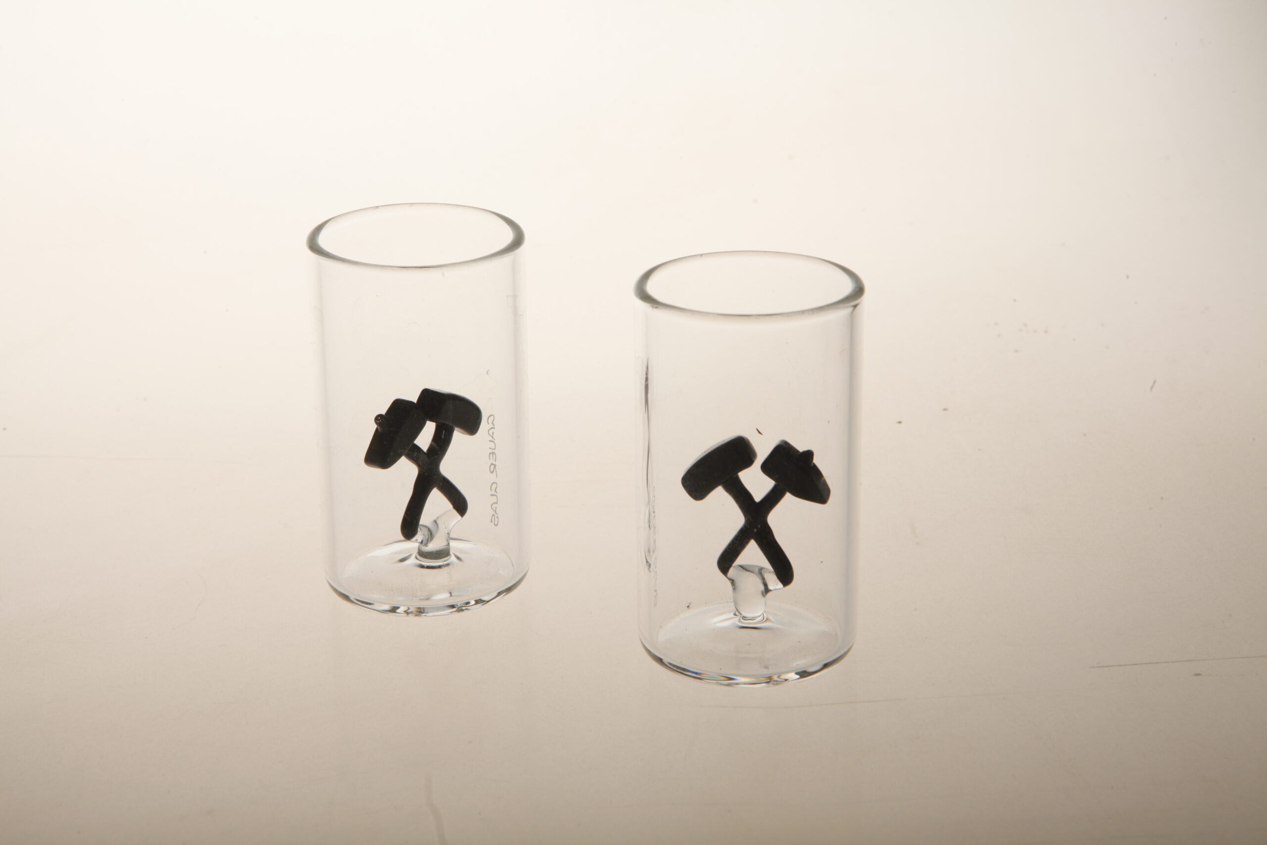 Ein kleines aber originelles Glas. Innen befinden sich Hammer und Schlegel, das Bergwerkszeichen schlechthin.