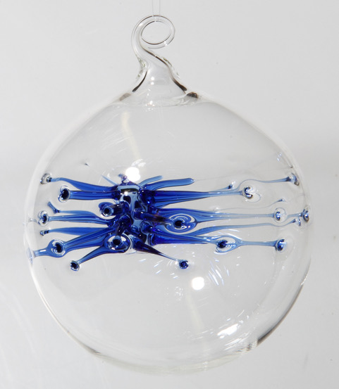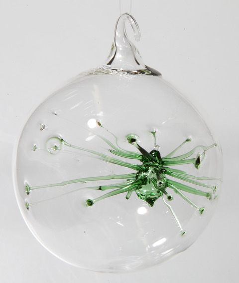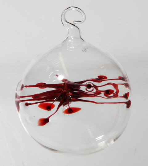 Klare dekorative Kugel, deren farbiges „Innenleben“ sich wie eine Spinne an die Kugel haftet